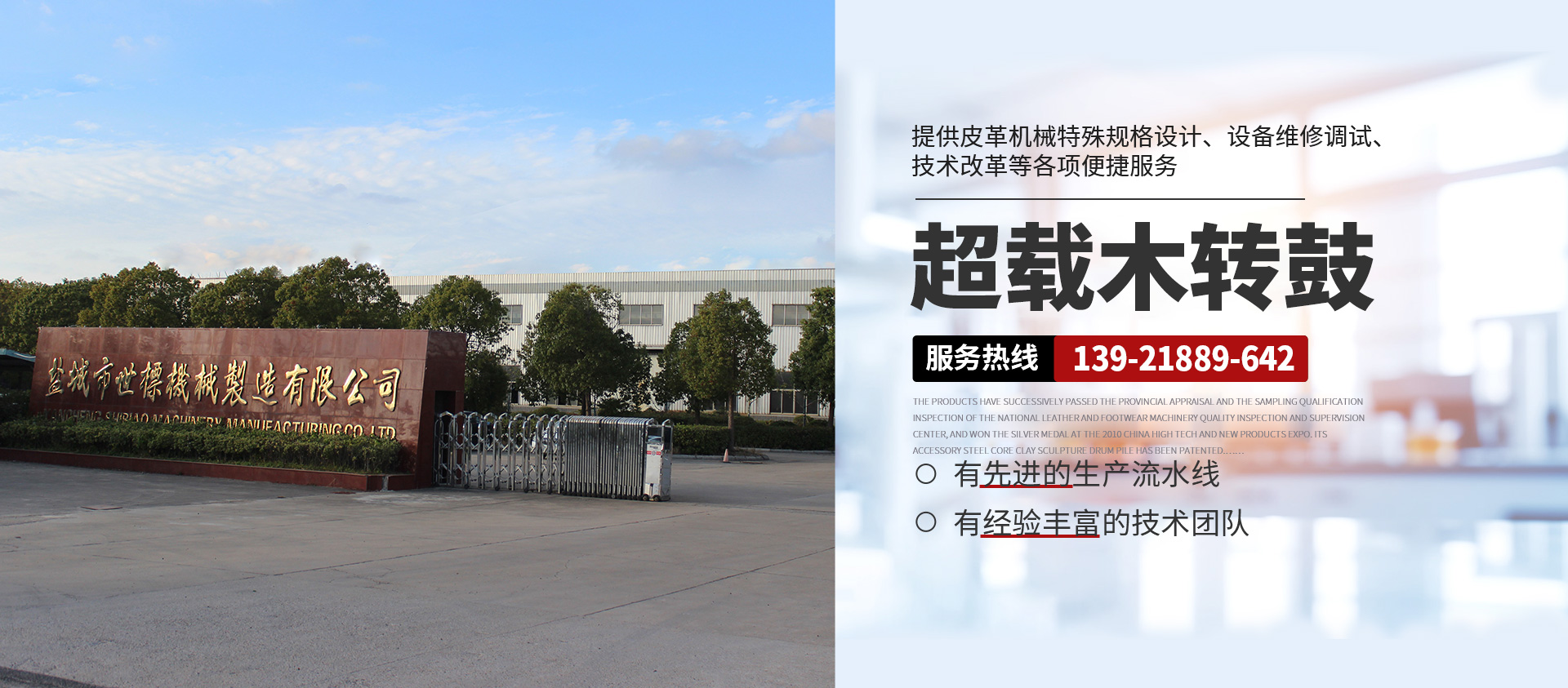 本公司常年提供超載木制轉(zhuǎn)鼓( 意大利/西班牙版本)、GJOB1-2型懸掛式木制轉(zhuǎn)鼓、鐵制轉(zhuǎn)鼓、Y型不銹鋼全自動(dòng)分格鼓、全自動(dòng)不銹鋼圓形、八角形摔軟轉(zhuǎn)鼓、PP染色等多功能轉(zhuǎn)鼓、HC系列劃槽、不銹鋼試驗(yàn)轉(zhuǎn)鼓等皮革機(jī)械產(chǎn)品,產(chǎn)品暢銷浙江、山東、廣東、福建、河南、河北、四川、新疆、遼寧等地,且遠(yuǎn)銷非洲、東南亞、南美洲、中美洲等多國,深受各大制革廠家的青睞。產(chǎn)品相繼通過省級(jí)鑒定和全國皮革、制鞋機(jī)械質(zhì)量檢測(cè)監(jiān)督中心的抽樣合格檢驗(yàn),在2010中國高新技術(shù)、新產(chǎn)品博覽會(huì)上一舉榮登銀獎(jiǎng)寶座,其配件鋼芯泥塑鼓樁獲 專利權(quán)。本公司并向客戶提供皮革機(jī)械特殊規(guī)格設(shè)計(jì)、設(shè)備維修調(diào)試、技術(shù)改革等各項(xiàng)便捷服務(wù),具有健全的檢測(cè)體系和可靠的售后服務(wù)。
